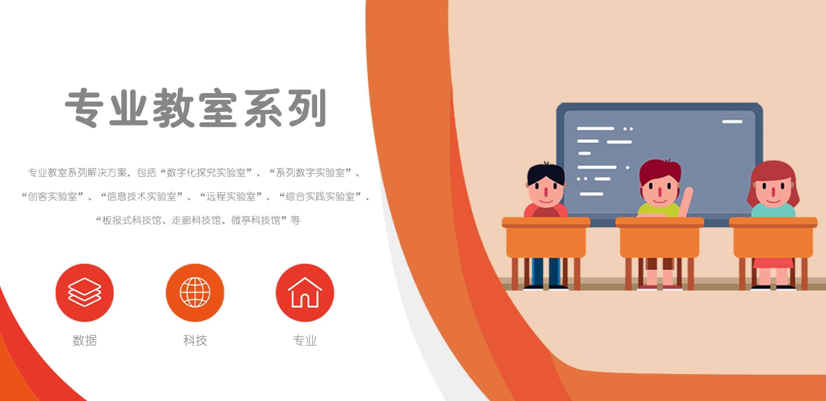 專業(yè)教室系列解決方案,包括“數(shù)字化探究實驗室”、“系列數(shù)字實驗室”、“創(chuàng)客實驗室”、“信息技術實驗室”、“遠程實驗室”、“綜合實踐實驗室”、“板報式科技館、走廊科技館、微亭科技館”等